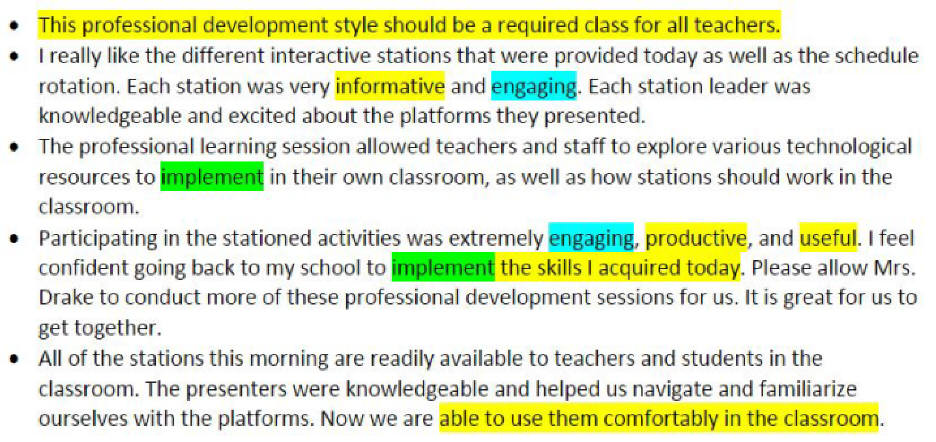 850+ teachers participated in three-hour professional development sessions titled "Student Success Through Stations" or "Questioning and Feedback." The feedback above is from participants in the November 2023 professional learning session that I organized to featured classroom teachers. Provide instructional and professional leadership to faculty and staff members.